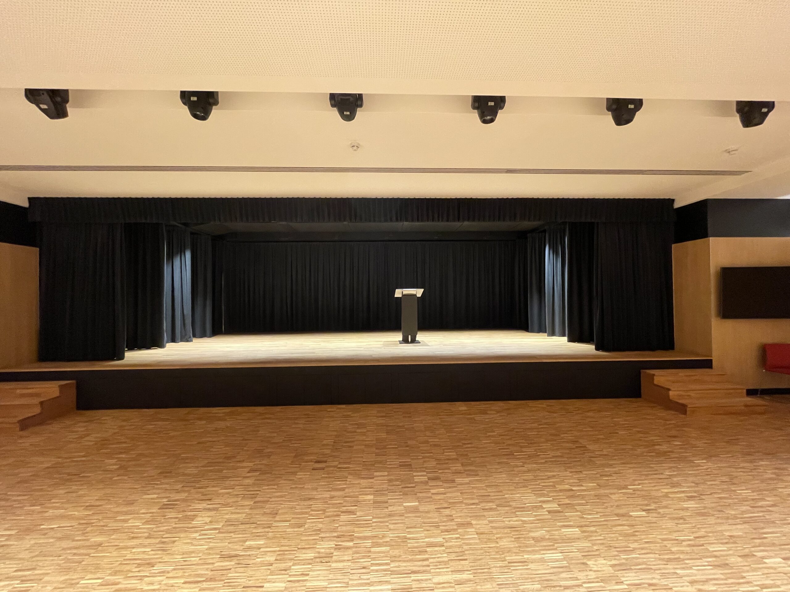 – Op der Bühn ass fir déi néideg Beliichtung gesuergt, Mikroe sinn natierlech och do a si mat der Soundanlag am Raum gekoppelt.