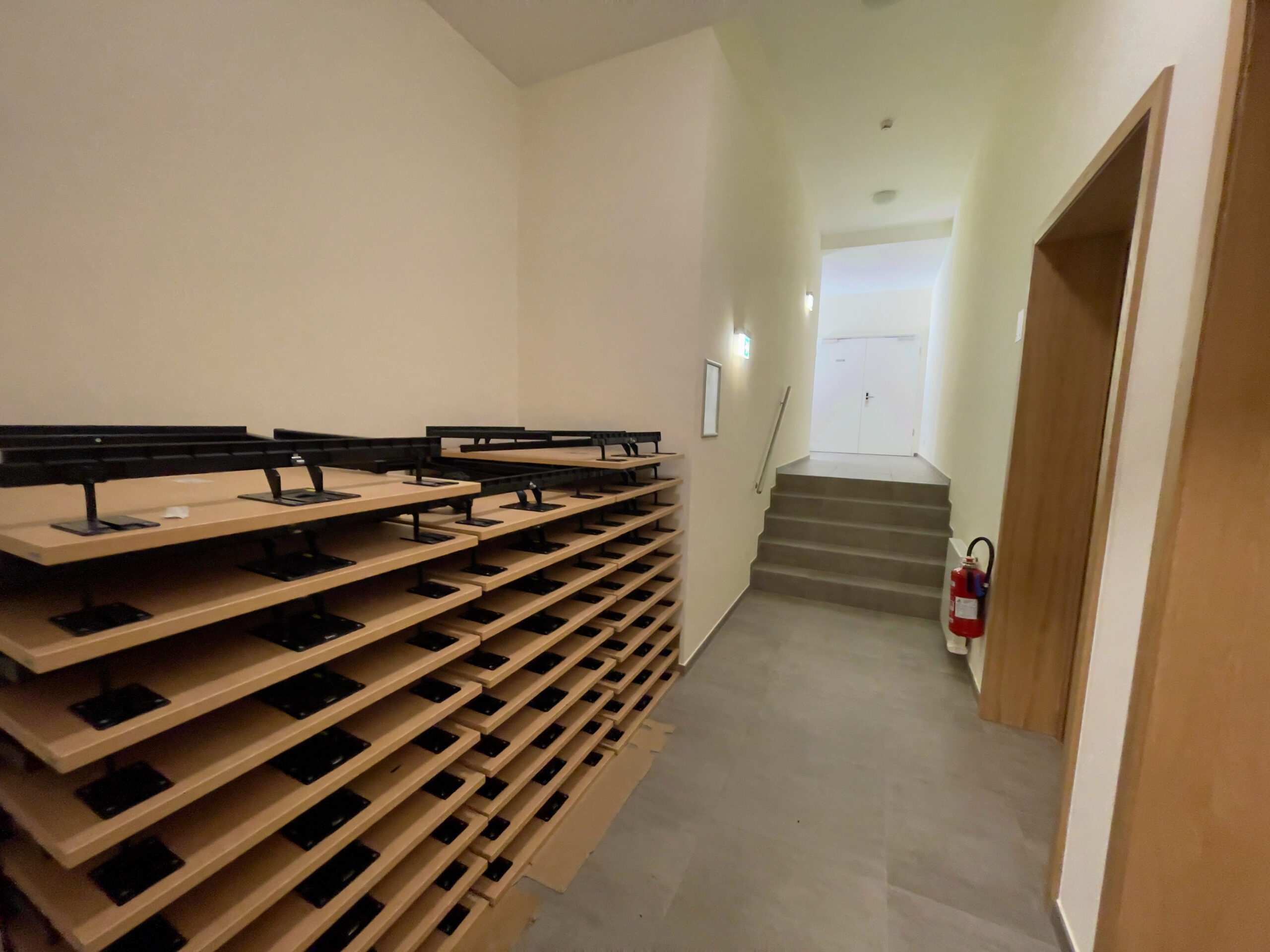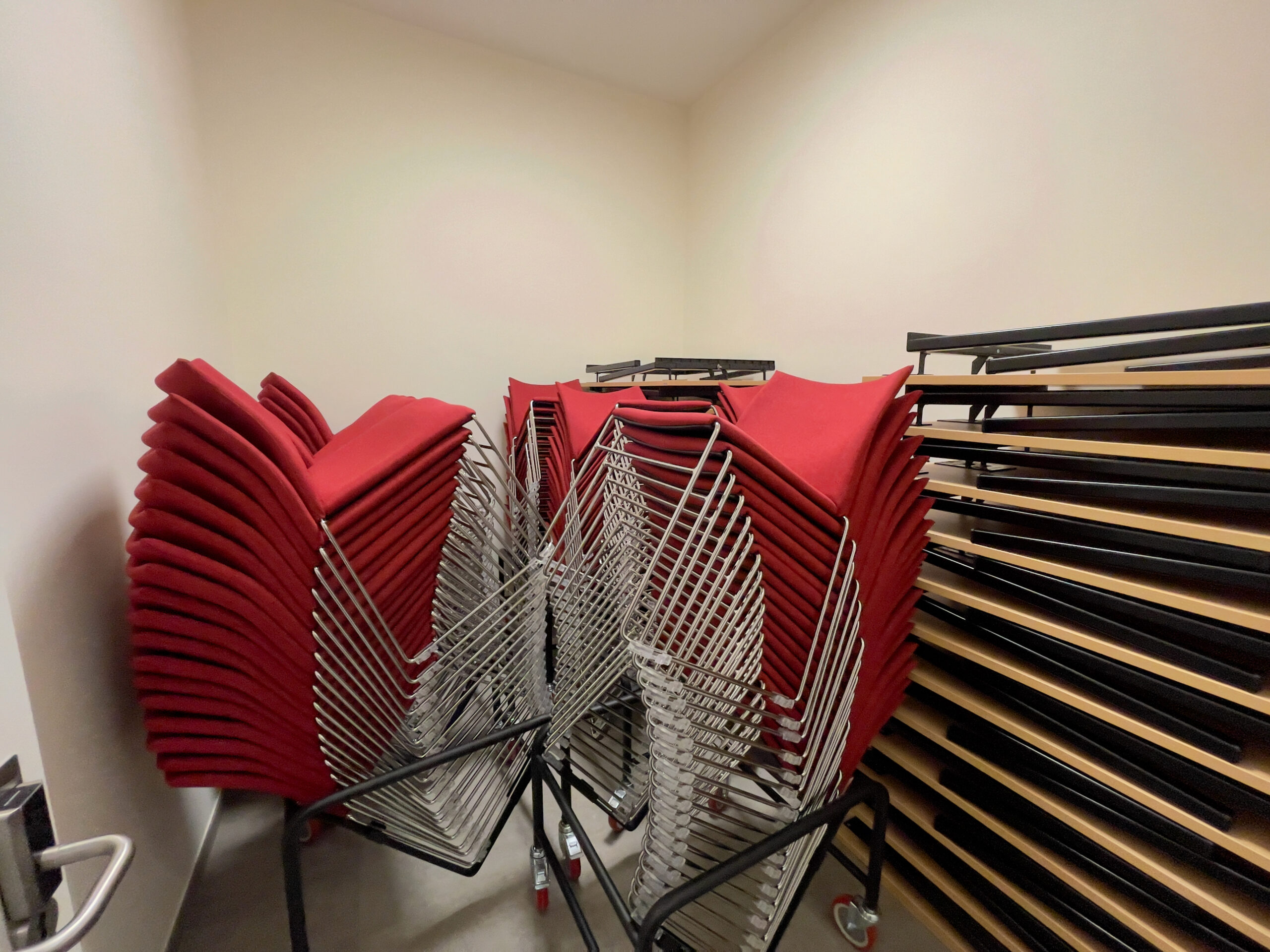 – Am Sall fannen, je no Manifestatioun (Detailer heizou fannt Dir ënnert dem Punkt “Lokatioun”), bis zu 72 Leit eng Sëtzplaz. Et stinn Dëscher zur Verfügung fir am Sall opzestellen.